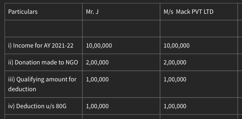 Mr. J is an individual and M/s. Mack Pvt. Ltd., a company, donates Rs 2,00,000 to a charitable organization. The total income for the assessment year 2021-22 (AY 2021-22) of both Mr. J and M/s. Mack Pvt. Ltd. is Rs 10,00,000. The tax benefit is as shown in the table:
